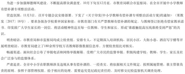 一.中小学校有偿补课行为。 二.在职中小学教师有偿补课行为。 三.校外培训机构各类违规行为。