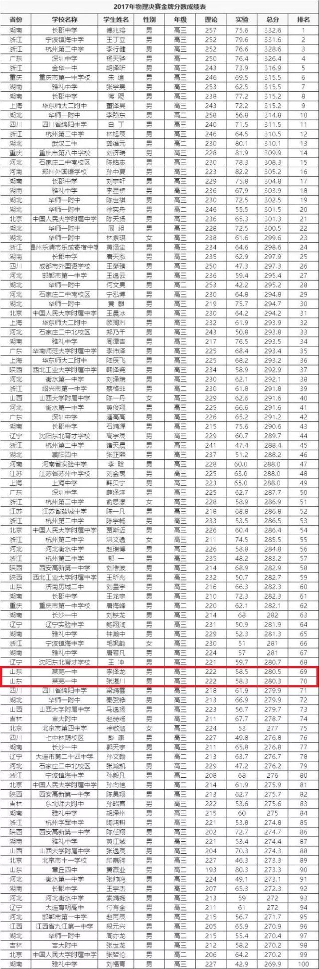 11月2日,第34届全国中学生物理竞赛决赛在重庆大学正式落幕,本次决赛全国共有364名考生参加,最终产生集训队50人,金牌100人(包括集训队),银牌120人,铜牌144人。其中,莱市第一中学两人以超出金牌分数线10分的好成绩获得金牌奖。 第34届全国中学生物理竞赛决赛,国家集训队分数线为287分,国家金牌分数线为270分,国家银牌分数线为220分。莱芜一中三名同学分别摘得两枚金牌一枚银牌。 据悉,第三十四届全国中学生物理竞赛决赛共有来自全国32个省市(自治区)的代表队参赛,参赛学生共364人,山东省有九名同学进入省队,而莱芜一中就有三人! 据悉,三名同学已全部与北大签约一本线录取! 厉害了我人才辈出的大莱芜 厉害了我的莱芜一中 为这三名同学点赞! 为莱芜一中点赞!