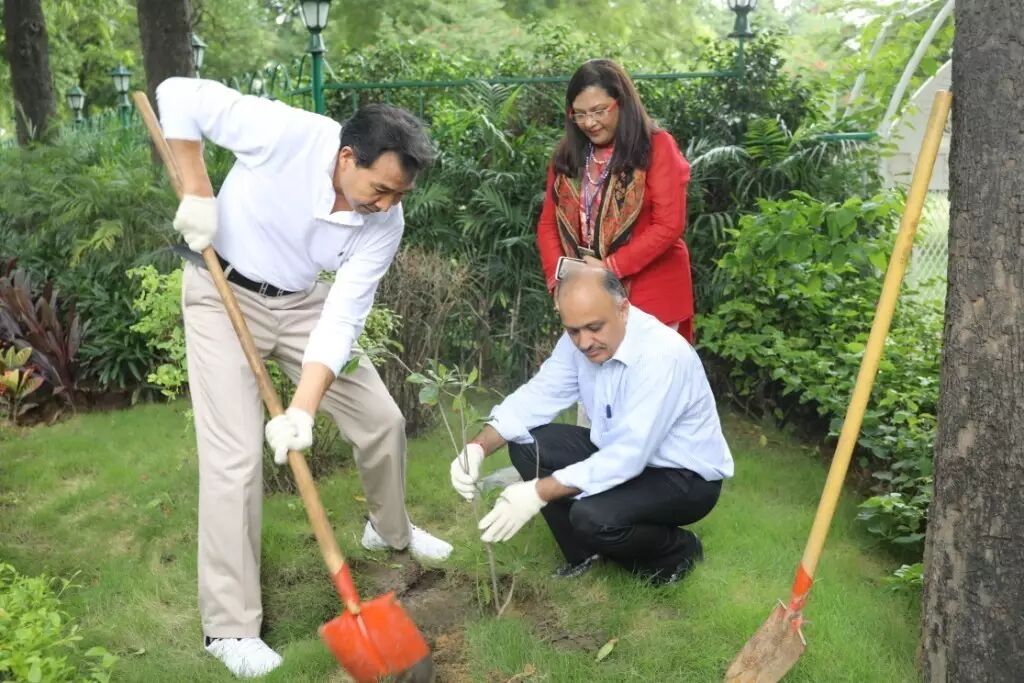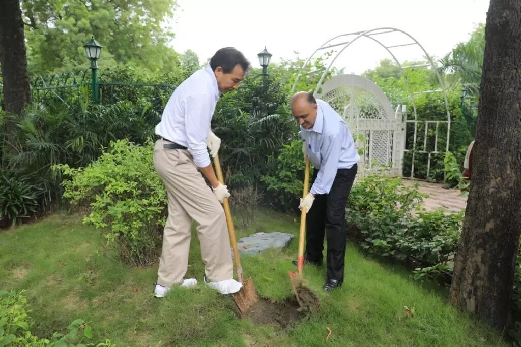 罗大使与库马尔主席共同在使馆正门口种下一株仁心果树,随后在官邸交谈。罗大使感谢德里市长期以来对使馆的支持与帮助,表示植树绿化不仅可以美化环境,还能净化空气,有益民众和驻印外交官身心健康。中国使馆将积极支持德里市相关活动,共创德里使馆区优美环境。