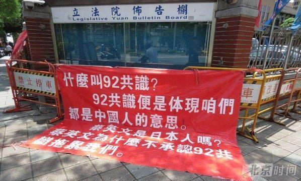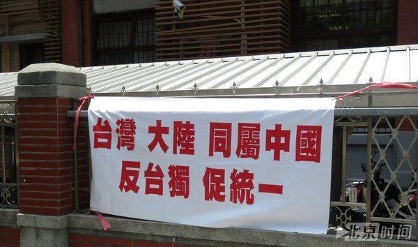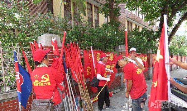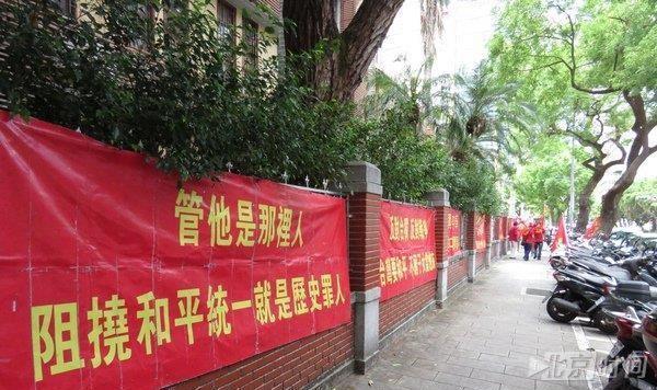 今天(8日)早上,“统派”的“爱国同心会”也不甘示弱,在台“立院”旁的青岛东路边搭起活动帐篷,在人行道及机车道上插满一排五星红旗和标语。