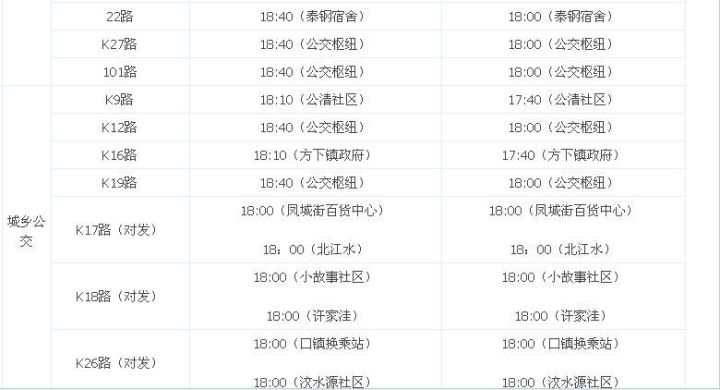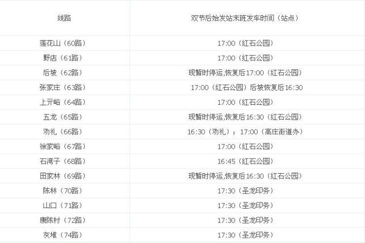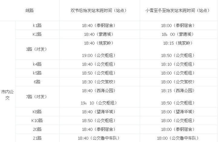 10月9日,市内公交末班车发车时间为18:40,城乡公交末班车发车时间为18:30(K9、K16路末班车发车时间为18:10),根据季节变化,逐步缩短末班车发车时间,小雪(11月22日)至冬至日(12月22日),市内公交和城乡公交末班车发车时间减至最晚18:00(K9、K16路末班车发车时间为17:40),冬至后逐步延长末班车发车时间。国庆节后至明年五一,南部山区线路、口镇乡镇线路及K17路、K18路、K26路等线路都按照冬季运营时间发车。详情如下表: