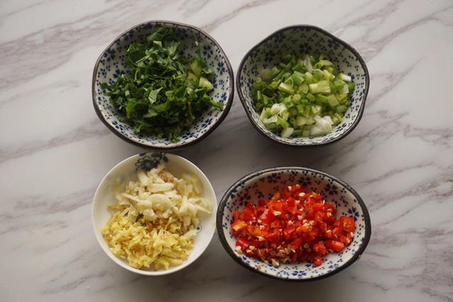 3.将大蒜、老姜切碎;小米辣剁碎;葱切成花;香菜切碎待用