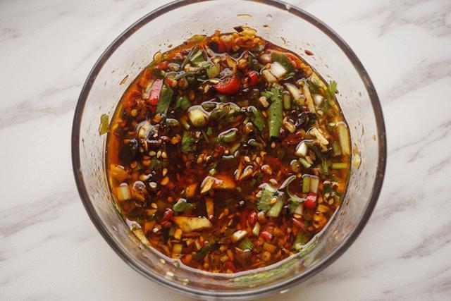 5.将小米辣、香菜碎、葱花、蒜末、姜米、酱油、鲜辣露、红油、花椒油、陈醋、香油、盐拌匀成汁儿待用
