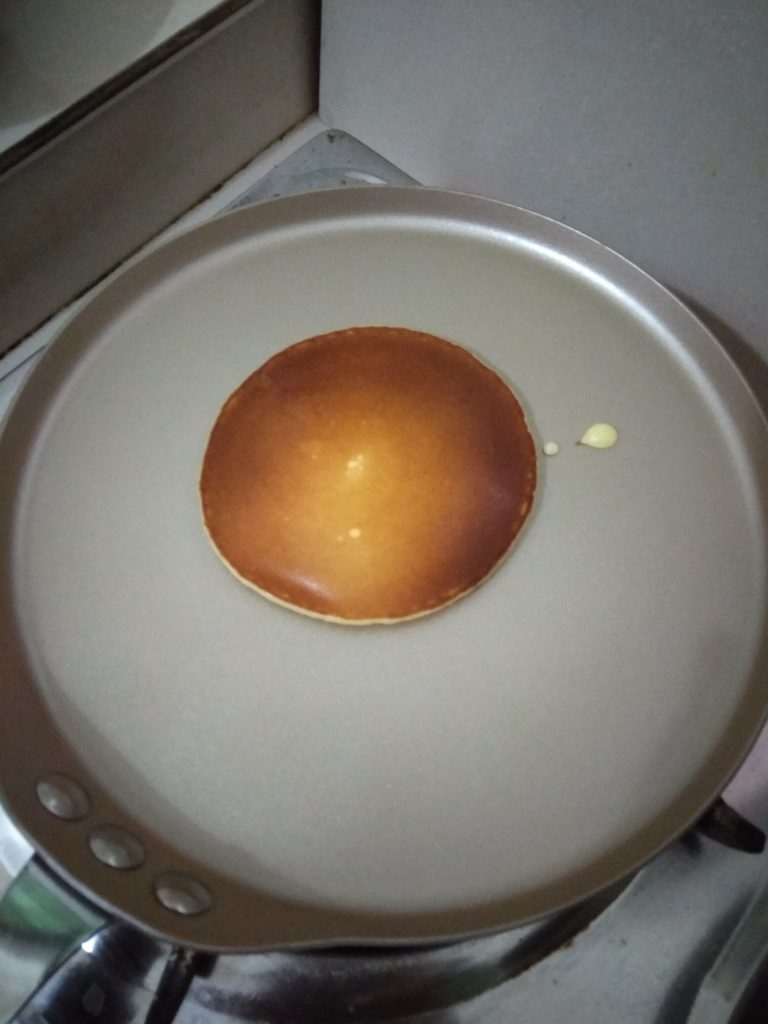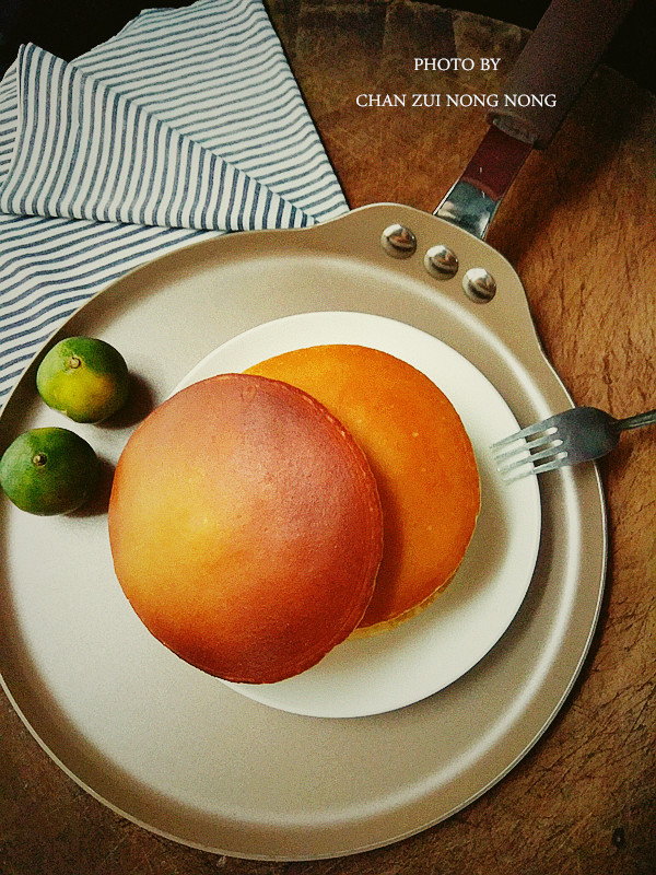7、翻面后稍微煎个几秒,就可以了。(每煎完一块,要将锅放在湿布上降一下温,再接着煎下一块,而且要离火倒面糊,不然温度太高了,面糊倒上去的时候,底部容易出现花纹,上色不均,就煎不出好看的饼皮了)。