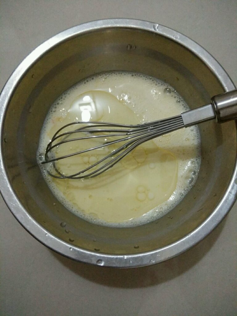 2、将鸡蛋、牛奶、蜂蜜和糖放到碗里,搅拌均匀。