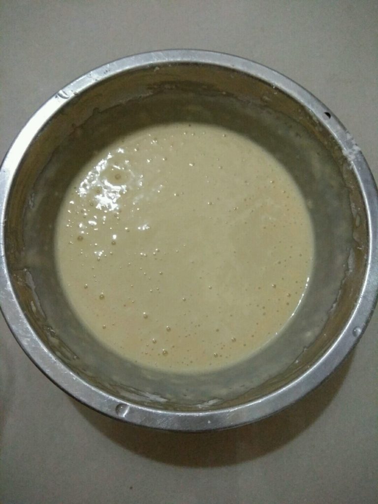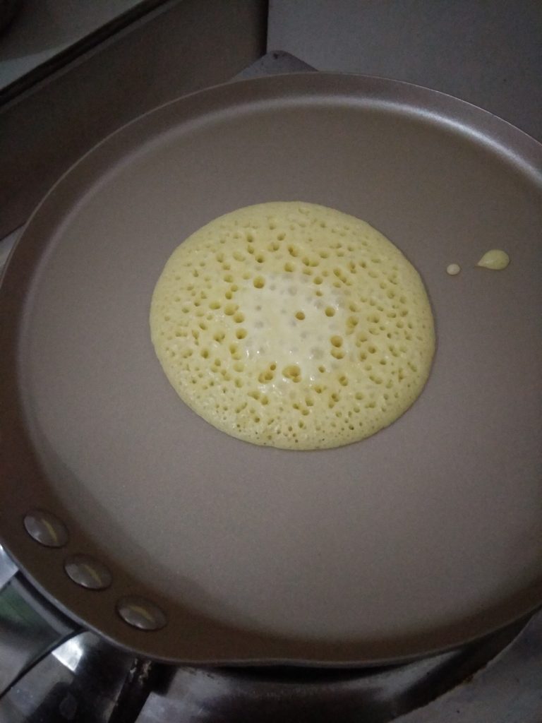 6、直到面糊表面冒出很多小泡泡,并且不断破裂,就可以翻面了。