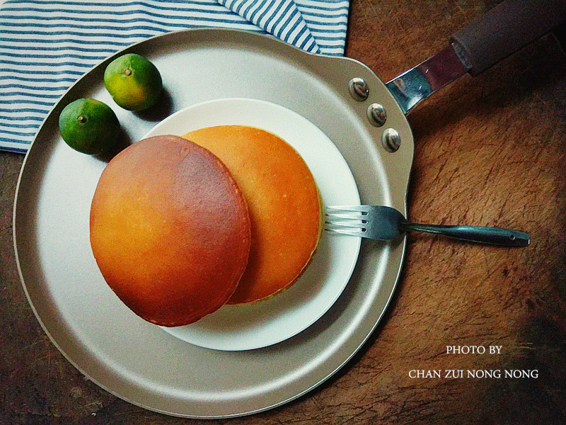 每煎完一块,要将锅放在湿布上降一下温,再接着煎下一块,而且要离火倒面糊,不然温度太高了,面糊倒上去的时候,底部容易出现花纹,上色不均,就煎不出好看的饼皮了。