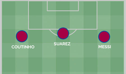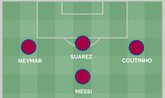 这或许是现阶段最理想的配置组合:将梅西后撤到中场中路,库蒂尼奥打右翼,MSN组合继续保留,库鸟的加盟曲线实现了接班伊涅斯塔,巴萨也可变阵为3313,这似乎是最优选择。2016-17赛季,恩里克麾下的巴萨曾尝试过这样的打法,也打出了当季、甚至是足球历史上最伟大的逆转,欧冠淘汰赛阶段巴萨总比分0-4落后PSG,就是利用3313阵型实现了惊天逆转。
