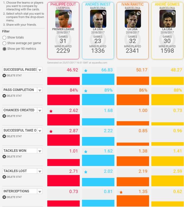 看了库蒂尼奥的综合数据,似乎预示其暂时还不能直接胜任中前卫这样的全场枢纽角色,至少需要经过长期且严格的训练,库鸟才能完成转型以适应这个新位置。这也解释了为什么一年前巴萨会在安德烈-戈麦斯身上豪赌,那么今夏巴萨如此迫切地欲引进库蒂尼奥究竟会将他放在哪里?