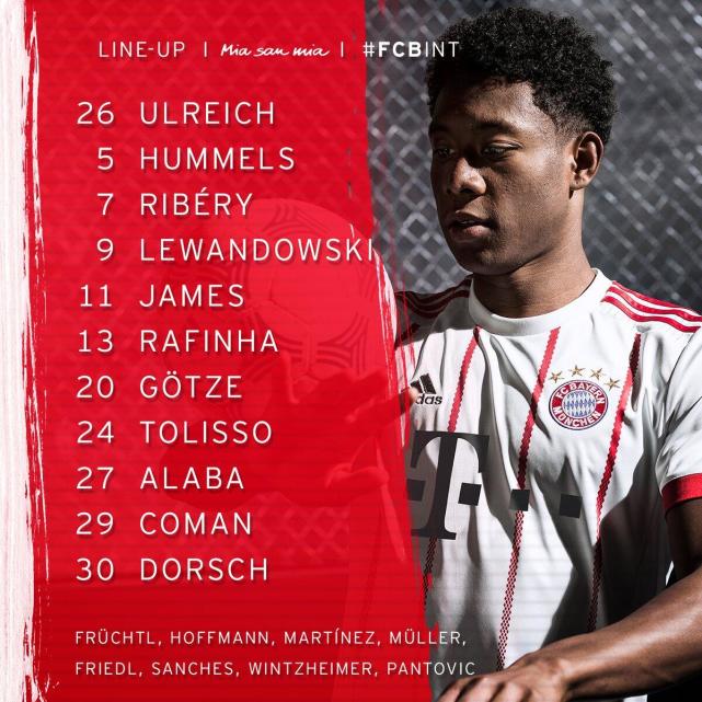 腾讯体育7月27日讯 北京时间7月27日晚19时35分,在2017国际冠军杯新加坡站的一场比赛中,拜仁慕尼黑对阵国际米兰。赛前双方首发及替补名单公布。