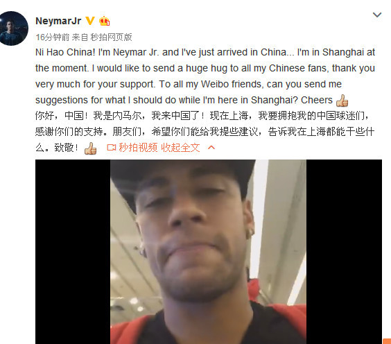在个人中文微博上,内马尔宣布了自己来到上海的消息,他用中英文写道,“Ni Hao China! I'm Neymar Jr. and I've just arrived in China... I'm in Shanghai at the moment. I would like to send a huge hug to all my Chinese fans, thank you very much for your support. To all my Weibo friends, can you send me suggestions for what I should do while I'm here in Shanghai? Cheers.你好,中国!我是内马尔,我来中国了!现在上海,我要拥抱我的中国球迷们,感谢你们的支持。朋友们,希望你们能给我提些建议,告诉我在上海都能干些什么。致敬!”
