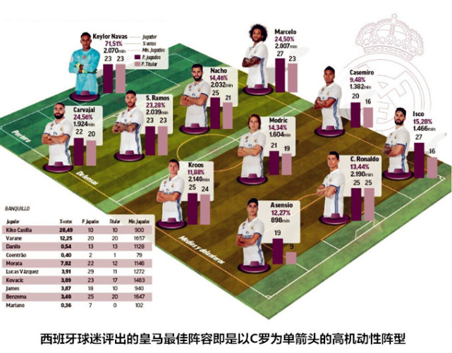 自2014/15赛季以来,J罗和伊斯科之间的竞争便是贯穿皇马战术演进历程中的一条主线,历任主帅中只有安切洛蒂打造的双边前腰4222阵型可以完美地实现两人共存,贝尼特斯和齐达内更多地是根据具体比赛的要求择其一而用之。经过2014夏窗的大换血,皇马的中场逐渐由阿隆索-莫德里奇-迪马利亚时代的直线型冲击打法,过渡到了由克罗斯和莫德里奇主导的控制/提速型打法,脚下技术更加细腻、节奏控制力更强的伊斯科成为了这种变化的受益者,金童在激烈的内部竞争中因势利导地放弃了过往的核心踢法,转而切换到了类似于润滑剂和加速器的副核打法,在牺牲了包括场均射门和成功过人等华丽数据的同时,获得了战术地位和队内认可度的提升。