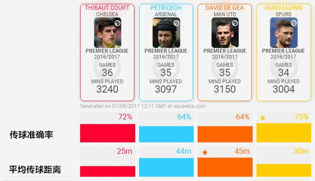 作为一名门将来说,想要保持稳定而精准的出球并不是什么简单的任务。绝大多数情况下,门将不会站在球门范围内接应队友的回传球,这意味着一旦门将出球或者带球失误,那对手就会获得直面空门的机会。但是库尔图瓦始终能在对手前锋的凶悍逼抢之中游刃有余。与切赫、洛里、德赫亚相比,库尔图瓦的传球成功率高达72%,但是平均传球距离则是4人中最低的。这代表比利时人多数情况下的传球时有目的的短传,而非惊慌失措时的大脚解围。