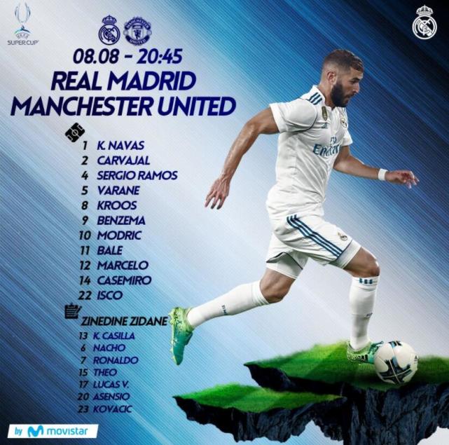 腾讯体育8月9日讯 今日凌晨2:45,2017年欧洲超级杯中,欧冠冠军皇马出战欧联杯冠军曼联。两队首发已公布,贝尔本泽马搭档皇马锋线,C罗进入替补席,莫德里奇伊斯科克罗斯坐镇中场,曼联方面,博格巴姆希塔良出战,卢卡库冲锋,新援马蒂奇同样首发: