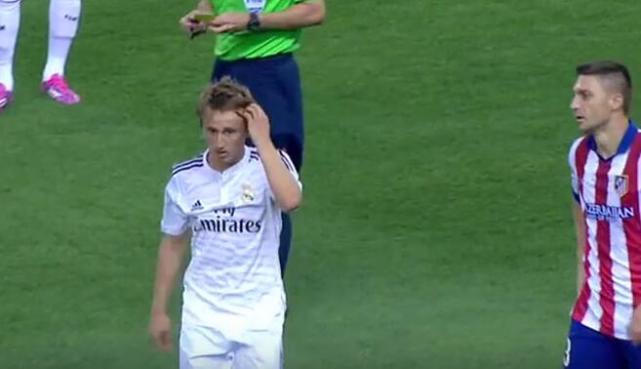 2014年8月22日,西班牙超级杯次回合,皇马对阵同城死敌马竞。比赛第89分钟,莫德里奇吃到本场比赛的第二张黄牌,从而染红离场并且停赛一场。由于这是皇马最近一次参加西班牙超级杯比赛,因此莫德里奇的停赛将延续到今年超级杯首回合比赛。