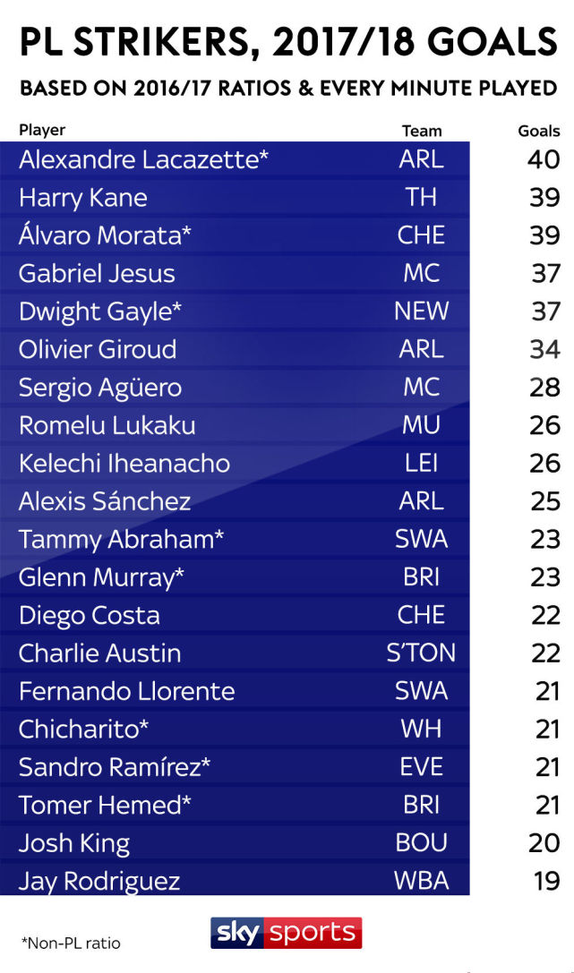 英媒给出的预测全部是在球员全勤的情况下给出的,上个赛季的法甲联赛,拉卡泽特出场了2408分钟,一共打入了28球,效率非常高。按照拉卡泽特在法甲的进球效率,如果保持在英超全勤,出场3420分钟,那么他可以打入40个英超进球。上个赛季,英超射手王哈里-凯恩打入了29个联赛进球,出场次数是30次,出场时间是2531分钟,如果全勤的话,那么凯恩可以在新赛季打入39个联赛进球。