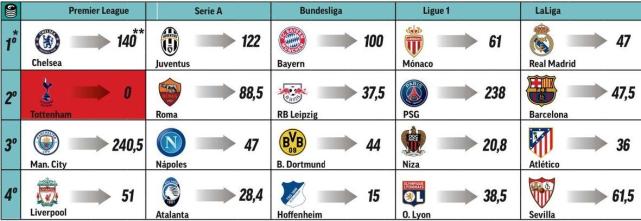 热刺是五大联赛排名前四的20支球队中唯一没有引援的球队