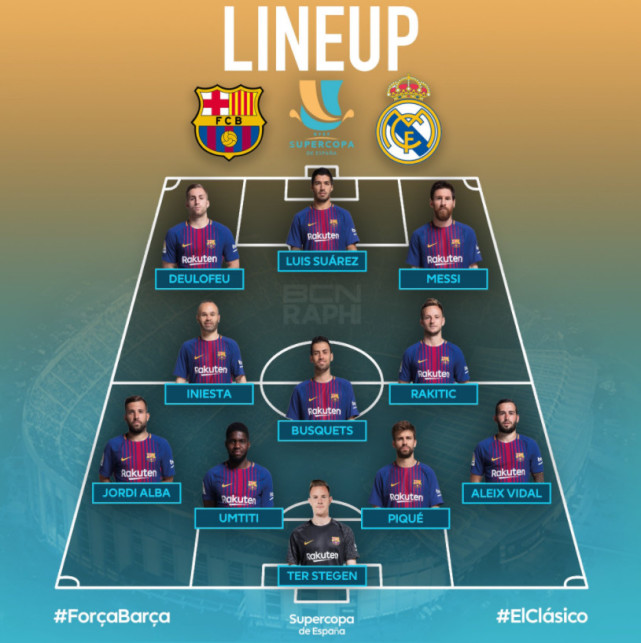 巴塞罗那(4-3-3):特尔施特根;比达尔,皮克,乌姆蒂蒂,阿尔瓦;拉基蒂奇,布斯克茨,伊涅斯塔;梅西,苏亚雷斯,德乌洛费乌