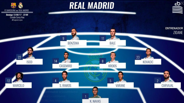 皇家马德里(4-4-2):纳瓦斯;卡瓦哈尔,瓦拉内,拉莫斯,马塞洛;科瓦契奇,卡塞米罗,克罗斯,伊斯科;本泽马,贝尔