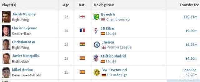 纽卡今夏5名新援:雅各布·墨菲、勒热纳、阿楚、曼基略、梅里诺。