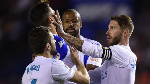 此役54分钟,双方球员场上发生激烈冲突,拉莫斯情绪最为激动,冲上前伸左手一把推在对手中卫舍尔的脸上,拉科今夏刚签下的这位瑞士国脚,立刻被推翻倒地痛苦不已。这次赤裸裸的袭击动作,可谓火上浇油,双方冲突迅速升级,多名球员互相推搡。