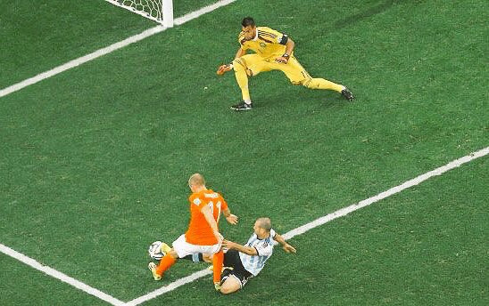 马斯切拉诺铲断罗本,成为世界杯经典