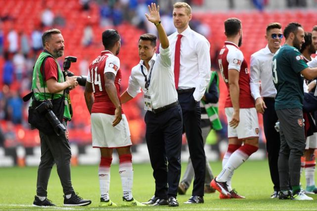桑切斯在上周二就返回阿森纳训练,不过,当时舆论就普遍认为他赶不上社区盾。果然,桑切斯昨晚连大名单都没进,但在阿森纳赢下点球大战后,身穿衬衣的智利人也加入到球队庆祝夺冠的行列。