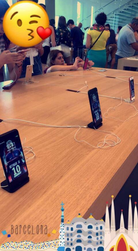 为此,一个愤怒的巴黎球迷悄悄来到了巴塞罗那,并来到一个苹果商店,偷偷将店内所有的苹果电脑、手机和ipad背景图换成了身穿巴黎球衣的内马尔!