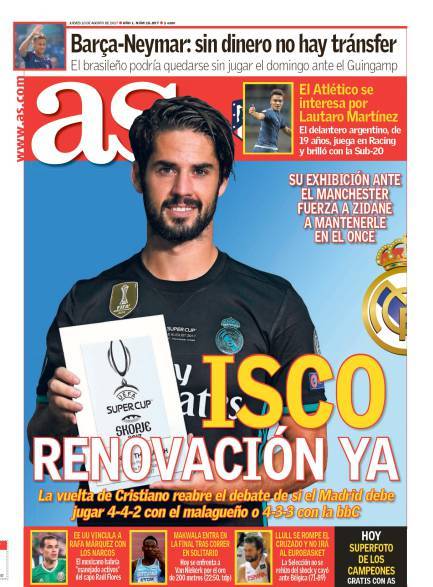 同日,《阿斯报》的封面人物是伊斯科,在看到前欧洲金童在超级杯中的精彩表现之后,该报已经在担心起他与皇马的合同问题了。明年夏天,伊斯科与皇马所签署的工作合同便将正式到期,而在最近几个月的时间里,西班牙媒体一直在爆炒巴塞罗那希望签下这名本土中场的新闻。在欧洲超级杯结束之后,伊斯科被评为了当场最佳球员,他在接受媒体记者采访时,并没有表达出任何明确的离队意愿。有接近于皇马的消息灵通人士向ESPN透露,本周伯纳乌方面将正式与伊斯科开启续约谈判。