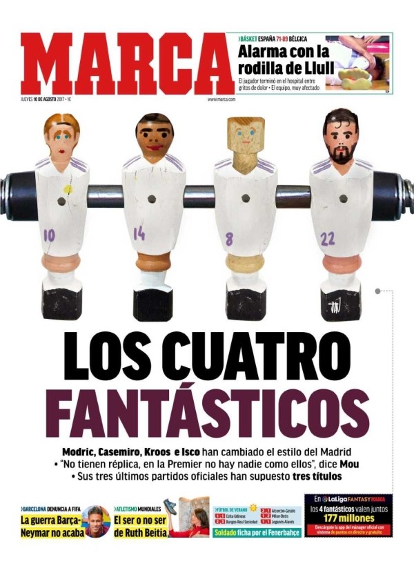 无独有偶,周四出版的《马卡报》封面,也被四名皇马中场球员所占据,该报将卡塞米罗、托尼-克罗斯、莫德里奇以及伊斯科称为“梦幻四人组”。《马卡报》的这一报道,在某种程度上反映出了媒体、球迷、评论专家观点的改变:之前,皇马最具新闻价值的,是由贝尔、本泽马、C罗组成的BBC进攻三叉戟,不过在最近一段时间里,这三名前场球员很少登上马德里媒体的头版头条了。