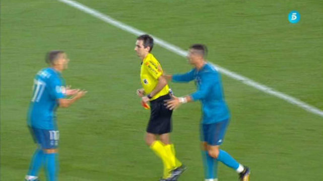 C罗本以为自己将获得点球,起身后却发现主裁向他亮出红牌,情绪激动的他连连抗议,但黑衣法官不为所动,C罗摊开双手表达不满情绪。随后转播镜头还拍到,皇马7号从身后推了主裁,不明所以的黑衣法官回头看了看C罗,但并没有进一步表示。
