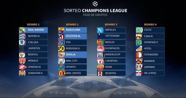 第二档:巴萨(西班牙)、马竞(西班牙)、巴黎圣日耳曼(法国)、曼城(英格兰)、多特蒙德(德国)、波尔图(葡萄牙)、曼联(英格兰)、塞维利亚(西班牙)