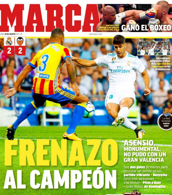 腾讯体育8月28日讯 C罗不在,阿森西奥当家,梅开二度将卫冕冠军从鬼门关拉回来,4战4球,成为全西甲最红新星,进球数与效率超越梅西,也就难怪C罗认为在C罗梅西之后,阿森西奥具备成为金球先生的素质,《马卡报》点赞,“C罗说得有理。”