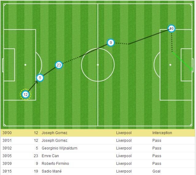 后3个进球,都是从后场发动的反击。区别在于1次是萨拉赫直接抢断停球太大的贝莱林,长途奔袭单刀建功,另外2次是快速传递突破对手逼抢,一脚传球过中场,到前场。第2球,只用4传,耗时15秒,由马内内切破门;第4球,同样是4传,耗时17秒,由萨拉赫传中,斯图里奇头槌扣关。