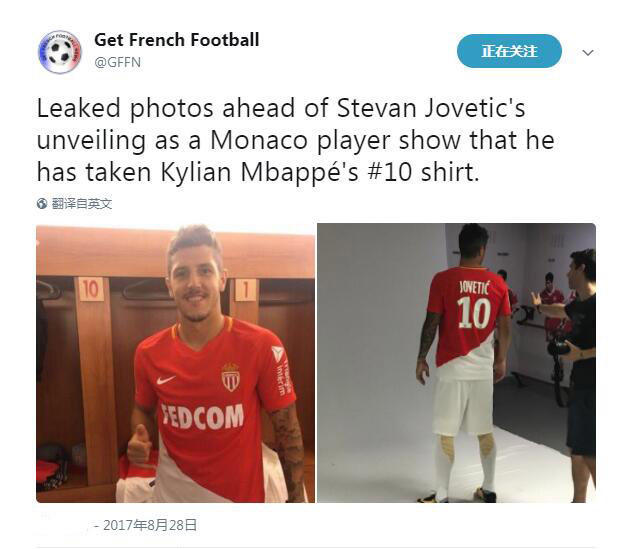 腾讯体育8月28日讯 巴黎在今夏以2.22亿欧元签下了内马尔,也成为了今夏转会市场最引人关注的球队之一。而在近段时间有关巴黎将会签下姆巴佩的消息也是不绝于耳。法国媒体《队报》称,巴黎将会租借姆巴佩一个赛季,随后在赛季末以1.8亿欧元买断姆巴佩。而就在不久前,西班牙媒体《世界体育报》流出了约维蒂奇身穿摩纳哥十号球衣的照片,而摩纳哥十号球衣本身的拥有者就是姆巴佩,因此这也被认为是姆巴佩即将加盟巴黎的标志。