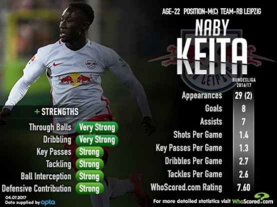 在两支红牛队,凯塔正如红牛的那句广告语一样,能量超乎想象。在德甲的处子赛季,凯塔帮助球队拿到亚军,进军欧冠。凯塔的表现也一如既往的耀眼,在上赛季德甲最佳阵容的评选中,凯塔的得分仅次于拜仁前锋莱万,理所当然地入选。