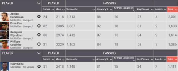 在库蒂尼奥一心想走的状况下,利物浦目前三中场最常见的选择是亨德森、埃姆雷·詹以及维纳尔杜姆。我们可以横向比较一下上赛季他们四人以及凯塔在攻防两端的表现。