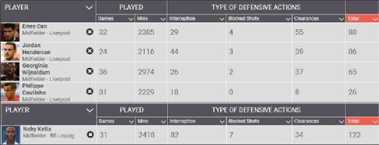 防守方面,凯塔在拦截数(82)上遥遥领先红军四将,几乎是防守型中场亨德森的两倍。
