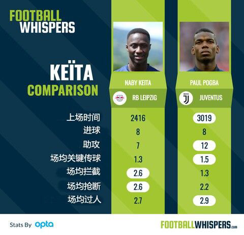 非洲小伙进球与博格巴持平,助攻数少5个,显然制造进球的效率不如博格巴。但同时也要考虑到,其在莱比锡的体系中相对靠近后场。场均关键传球上,凯塔比博格巴少了0.2次,场均成功过人次数也差了0.2次。不过在防守端的数据上,凯塔要领先不少,场均拦截和抢断都要高于博格巴。