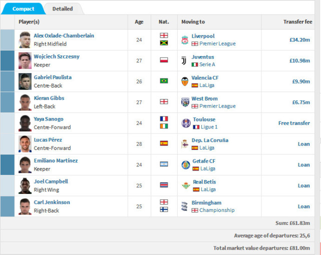 腾讯体育9月1日讯 在转会截止日,阿森纳疯狂的进行清洗,虽然头号大腿桑切斯留在了酋长球场,但是温格的球队也是送出了张伯伦、卢卡斯-佩雷斯、乔尔-坎贝尔三人,而今年夏天,阿森纳一共清洗了九人,虽然入账了6183万英镑,但是按照《转会市场》的价格,阿森纳还卖亏了不少!