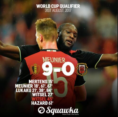 腾讯体育9月1日 世预赛欧洲区预选赛第7轮H组中,比利时9-0狂扫直布罗陀。由于双方实力非常悬殊,这一比分并不是很夸张,但后卫穆尼耶上演进球+助攻的帽子戏法,一人独自制造6球,此外卢卡库也打进3球,状态火热。