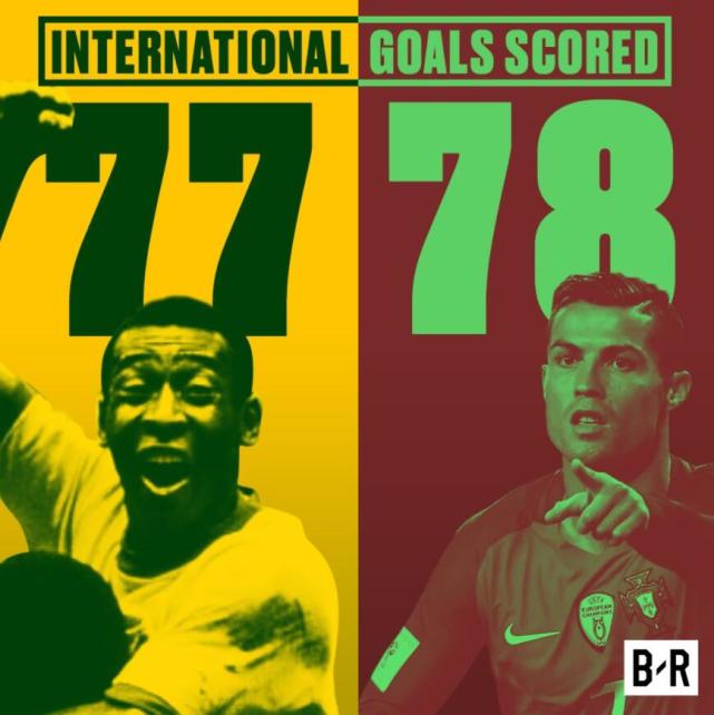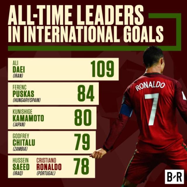 而在世界国家队射手榜上,C罗超越了打进77球的巴西球王贝利,并与伊拉克的侯赛因-萨伊德并列第5位,排在第1的是伊朗射手阿里-代伊,他在国家队攻进了109球。C罗虽然已经32岁,但他仍然保持着非常出色的竞技状态,他曾表态要踢到41岁,打破代伊的神纪录也不是没有可能。