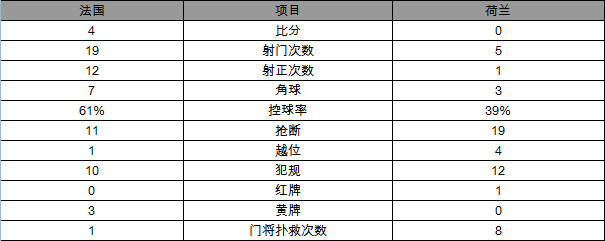 全场比赛,法国19次攻门12次射正打入4球,荷兰仅5次攻门1次射正颗粒无收。法国控球率达到61%,荷兰只有39%。