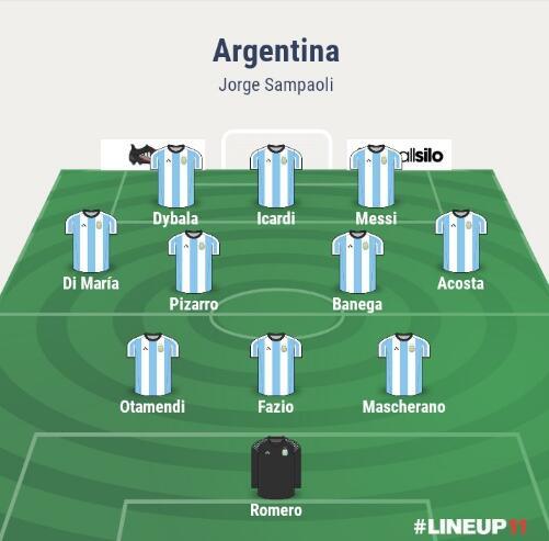 阿根廷(3-4-2-1):罗梅罗;马斯切拉诺,法希奥,奥塔门迪;阿科斯塔,皮萨罗,巴内加,迪马利亚;迪巴拉,梅西;伊卡尔迪