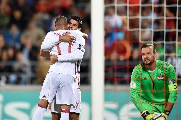 腾讯体育9月6日讯 西班牙锋线火力凶猛,本场莫拉塔2球1助攻,阿斯帕斯替补登场梅开二度,双枪合力包办4球。这对迭戈-科斯塔是警告,在切尔西失去位置的他,能不能去打世界杯,疑问重重。