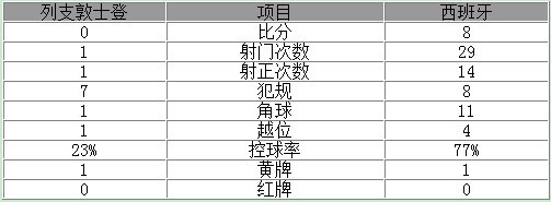 西班牙各项数据都占压倒性优势,控球率高达77%,射门多达29次,射正14次打入8球,角球同样11比1占优,主队全场只有1次射门。