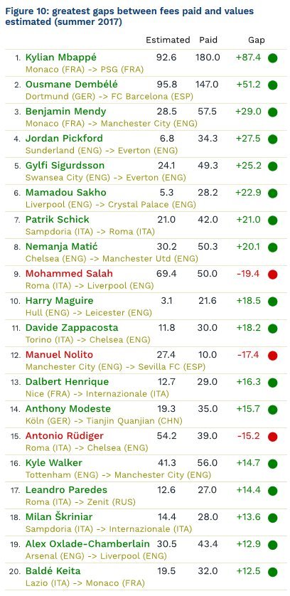 腾讯体育9月6日讯 转会市场的疯狂一夏刚刚过去,在这个夏天,有很多球员的转会费都高的离谱,通货膨胀的现象非常明显,瑞士著名足球研究机构CIES足球天文台对今夏转会情况进行了研究,给出了一份球员转会身价相比实际身价的溢价榜单,其中姆巴佩的转会费最为虚高,而利物浦购入萨拉赫则是一笔非常划算的交易。