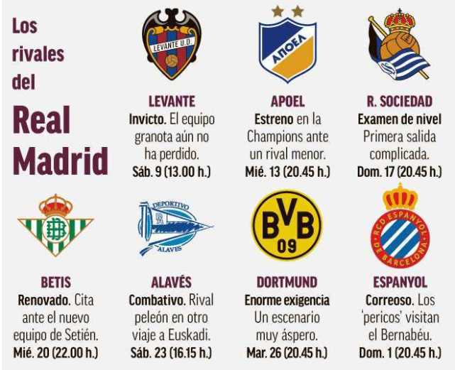 9月17日,在踢完欧冠仅仅四天后,皇马就将奔赴阿诺埃塔球场对阵皇家社会,而在9月20日,齐达内的球队会回到伯纳乌对阵皇家贝蒂斯。接下来,皇马将连续征战两个客场,9月23日,皇马会客场对阵阿拉维斯,然后在欧冠赛场,皇马将奔赴威斯特法伦球场和多特蒙德进行交锋。直到10月1日对阵西班牙人的比赛后,皇马才会暂时歇一口气,因为在10月15日,银河战舰才会再有正式比赛。