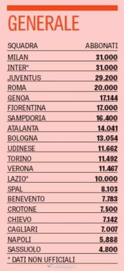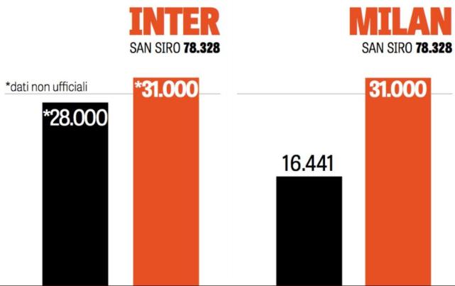 腾讯体育9月6日讯 一支球队季票销售情况的好坏在一定程度上代表着这支球队受欢迎的程度,而在近日意大利媒体《米兰体育报》对意甲20队的季票销售进行了一次统计,结果显示,米兰和国米的季票销售数量在意甲并列首位。尽管米兰的季票销售比上个赛季提高得最多,但还是有一些国米球迷在社交网络上酸酸地写到“花了2.3亿买人,季票销售还不是没有超过我们!”