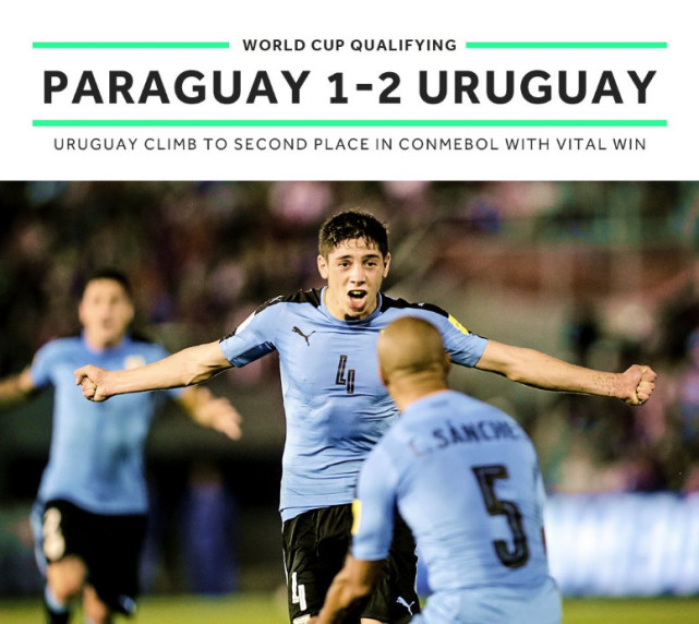 本轮乌拉圭2-1击败巴拉圭,世预赛史上首次客场击败老对手,16轮27分创世预赛队史最佳同期战绩。苏亚雷斯的球队已掌握晋级先手,最后两轮分别对垒排名垫底的两队,取胜1场就可确保杀入世界杯,因为四五名的秘鲁与阿根廷要直接对话,落后乌拉圭3分的两队,不可能同时达到30分。26分的哥伦比亚同样形势乐观,下轮主场对垒巴拉圭,末轮客战秘鲁,只要取胜1场也基本能锁定前4。